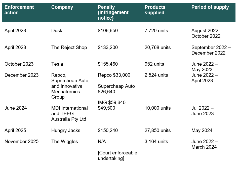 Note: Many of these companies were also required to take other action, such as improvements to their product compliance programs and court enforceable undertakings.